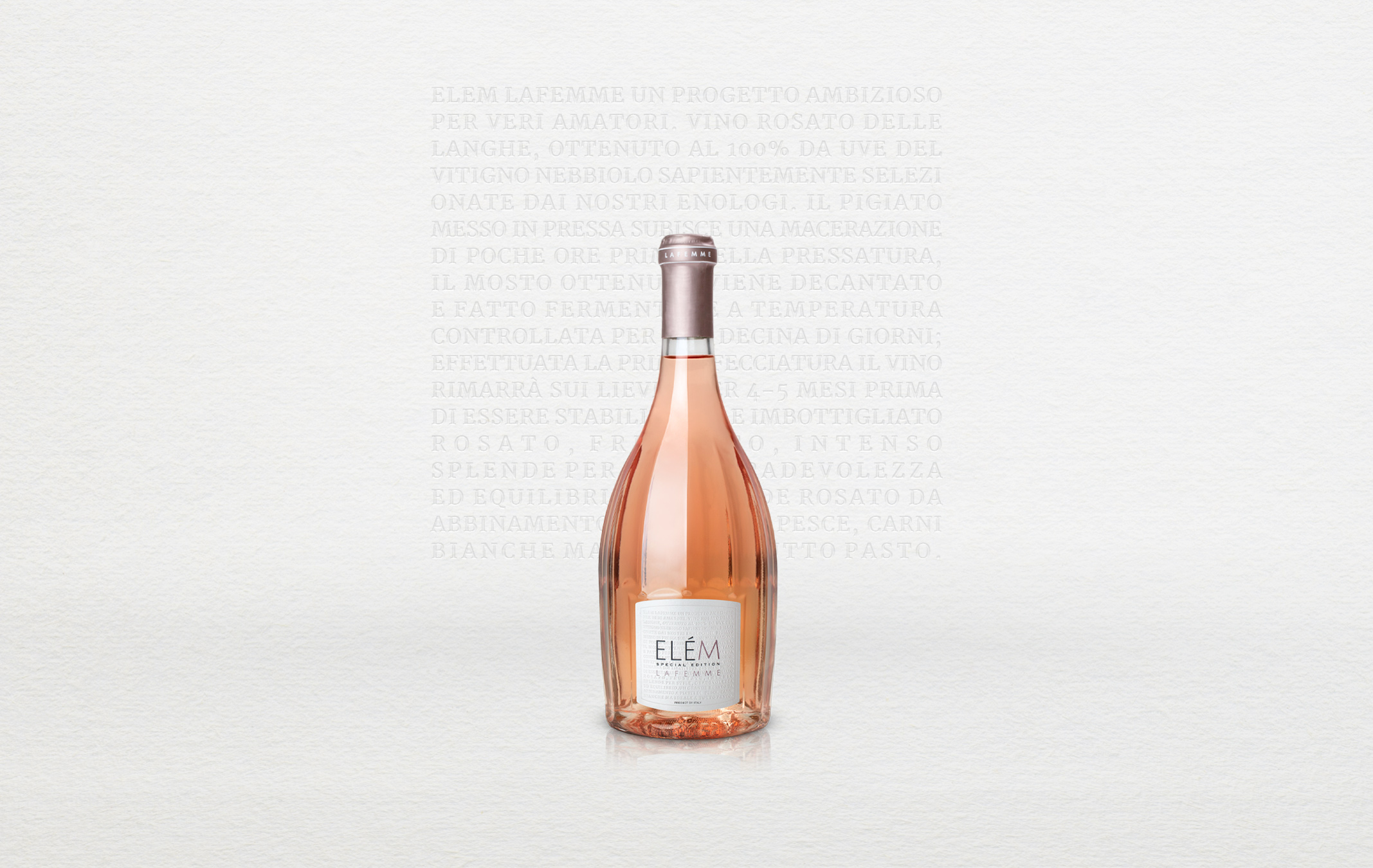 Elém è nato dall’idea di presentare non una semplice bottiglia, bensì l’Elém visiòn, una serie di sensazioni ed ispirazioni e tendenze del futuro, poichè lo scopo di Elém è proprio questo, seguire le tendenze per essere sempre i primi ad ispirare, creare, e sviluppare... spero sia di vostro gradimento, vi trasmetta belle emozioni e vi dia ispirazioni...